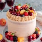 This Summer Fruit Sangria Cake is a light and fruity dessert perfect for warm-weather gatherings. Layers of tender sponge cake soaked in sangria are filled and frosted with a creamy white chocolate and berry whipped frosting, then topped with fresh summer fruits. It’s as beautiful as it is delicious.