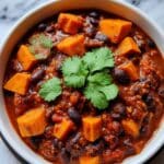 This Sweet Potato & Black Bean Vegetarian Chili is a hearty and flavorful dish perfect for a wholesome meal. Made with tender sweet potatoes, protein-packed black beans, fire-roasted diced tomatoes, and a blend of warm spices, this chili is slow-cooked in a crockpot to meld the flavors beautifully. It’s easy to prepare, adaptable for vegan diets, and perfect for meal prep with vibrant toppings like Greek yogurt, cilantro, and jalapeños to customize your bowl.