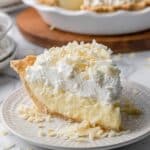 A slice of creamy pie sits on a white plate with a textured pattern, placed on a white marbled surface. The pie has three layers: a light golden-brown flaky crust at the bottom, a thick pale yellow creamy filling in the middle, and a fluffy white whipped topping sprinkled generously with white chocolate shavings. Surrounding the slice on the plate are scattered white chocolate flakes, adding extra texture and detail to the scene. In the background, a partial view of the full pie with a similar crust and topping is visible on a white pie dish on a wooden board, slightly blurred to focus on the slice. photo taken with an iphone --ar 4:5 --v 7