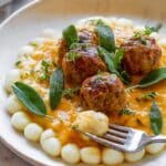 Delicious and cozy Turkey Meatballs in a rich, creamy Pumpkin Sage Sauce, perfect for fall. These meatballs combine ground turkey with fresh herbs and spices, lightly seared for a golden crust, then simmered in a flavorful pumpkin-based sauce with parmesan, cream, and fresh sage. Serve over gnocchi, pasta, or mashed potatoes for a comforting meal.